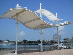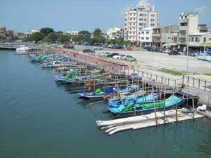 2、 漁人碼頭:漁人碼頭沿岸船隻停駁,充滿海濱的浪漫情調。路燈採竹笩造型打造,涼亭造型則為帆船的意象,與河港相互呼應。