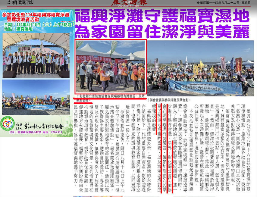 8/13張理事長率理監事志工20人,參加參加「114年度福興鄉溼地環境教育」活動」,本會除了淨灘現場還舉辦環境教育有獎徵答,活動圓滿結束。